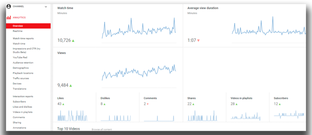 Wewnętrzne systemy pomiarowe. Aby dowiedzieć się, w jaki sposób każdy sponsorowany post/film wpłynął na wskaźniki Twojego biznesu e-commerce, platformy takie jak YouTube i Instagram mają własne wbudowane narzędzia analityczne. Z ich pomocą administratorzy mogą zobaczyć dane w czasie rzeczywistym, zażądać raportów, takich jak Zarobki, Czas oglądania i Zaangażowanie. Co więcej, jeśli chodzi o YouTube, można go zintegrować z Google Analytics, aby uzyskać lepszy obraz skuteczności kampanii. Zdjęcia takie jak poniższe są widoczne dla administratorów konta, co oznacza, że musisz uzgodnić zakres czasowy i poprosić swojego influencera o udostępnienie Ci analityki swojego profilu.