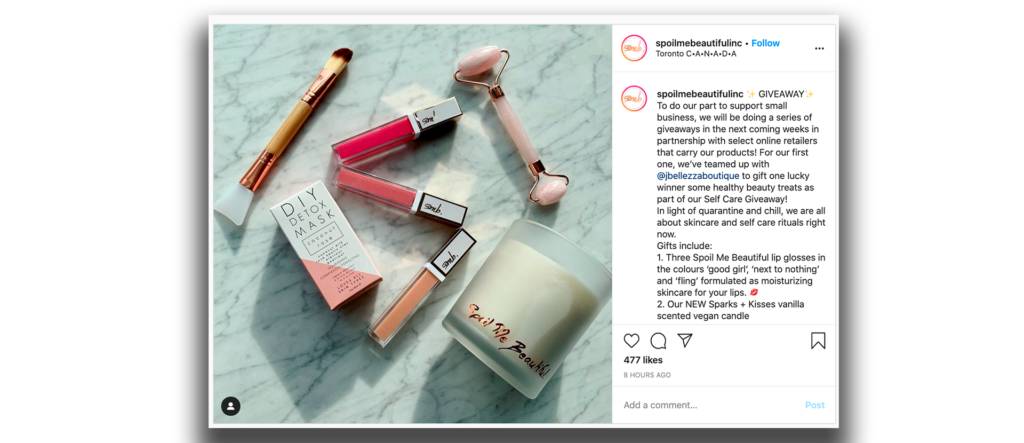 Blogger ogłasza konkurs, w którym można bezpłatnie rozdawać przedmioty upiększające określonej marki. Warunki obejmują między innymi: obserwowanie, polubienie, komentowanie, oznaczanie znajomego, udostępnianie, wzmianki w historiach obserwujących, tworzenie najlepszych nazw/wierszy/pomysłów itp. W poście są wymienione marki. Po zakończeniu konkursu zwycięzcy są wybierani przez losowanie lub wybór marki/influencera. Giveaway doskonale sprawdza się jako narzędzie promocyjne mające na celu zwiększenie świadomości marki.
