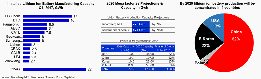 Chiński rynek xEV, największy na świecie, jest gotowy do powtórzenia tego samego w produkcji akumulatorów litowo-jonowych i oczekuje się, że do 2020 r. przechwyci 62% światowej produkcji. Globalnie, gigafabryka Tesla Motors, później przemianowana na „GIGAFACTORY 1” zapoczątkował megatrend, jakiego przemysł akumulatorowy nigdy wcześniej nie widział. Zainicjowała globalny wyścig o przesunięcie krzywej cen baterii znacznie wcześniej, przy jednoczesnym zwiększeniu korzyści skali z Indiami, jednak w większości prognoz nie ma nawet śladu na globalnej mapie produkcji baterii.