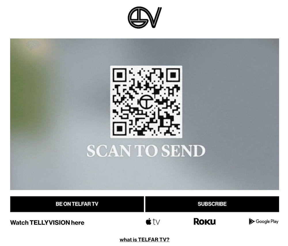 W niezapowiedzianych godzinach na zaledwie minutę pojawia się kod QR z ekskluzywnym, możliwym do kupienia linkiem do „kroplówki” nowych torebek. Jak widać powyżej, kody QR w Tellyvision firmy Telfar umożliwiają widzom przesyłanie własnych treści bez angażowania platformy społecznościowej innej firmy.