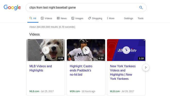 Google wyświetla wyniki wideo nie tylko na karcie Wideo, ale także zgodnie ze swoją zwykłą zawartością.