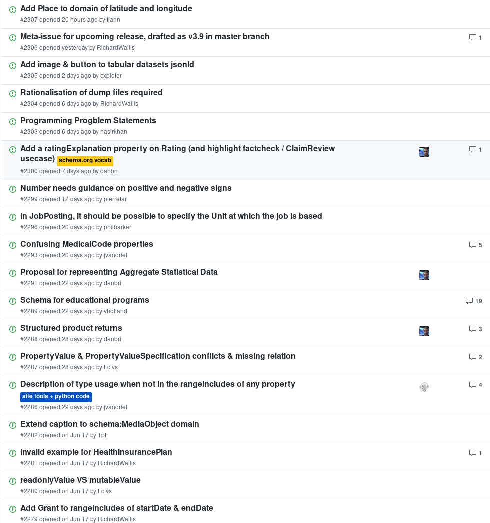 Powyżej znajduje się zrzut ekranu strony problemów z Github schema.org . To tutaj toczy się zdecydowana większość dyskusji dotyczących różnych typów schematów.