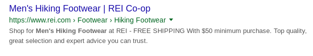 Bułka tarta pomaga wyświetlić hierarchię stron. Często będziesz je widzieć w wynikach wyszukiwania. Spójrz na adres URL tego wyniku wyszukiwania terminu „męskie buty trekkingowe”: