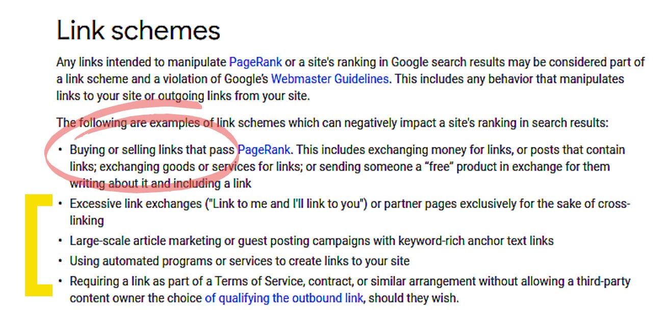 Google ma jasne wytyczne dotyczące schematów linków. Te wytyczne są regularnie publikowane przez firmy SEO i ekspertów, którzy starają się odwieść ludzi od kupowania linków zwrotnych; jednak właściciele witryn lekceważą ich ostrzeżenia, myśląc, że jest to tylko chwyt mający na celu przyciągnięcie klientów do płacenia ekspertom za tworzenie linków zwrotnych.
