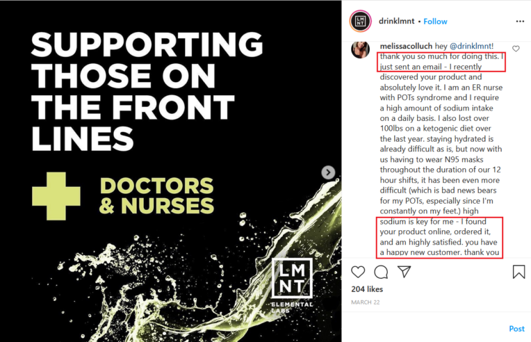 A LMNT iniciou uma campanha para apoiar as linhas de frente em meio ao COVID-19. A equipe LMNT postou um vídeo em série de si mesmos nas mídias sociais, agradecendo aos trabalhadores da linha de frente e pedindo aos espectadores que enviem um e-mail sobre a situação dos trabalhadores da linha de frente em sua área. Em resposta, a equipe LMNT distribuiu mais de 350.000 pacotes de sticks para esses profissionais para mostrar seu apoio.