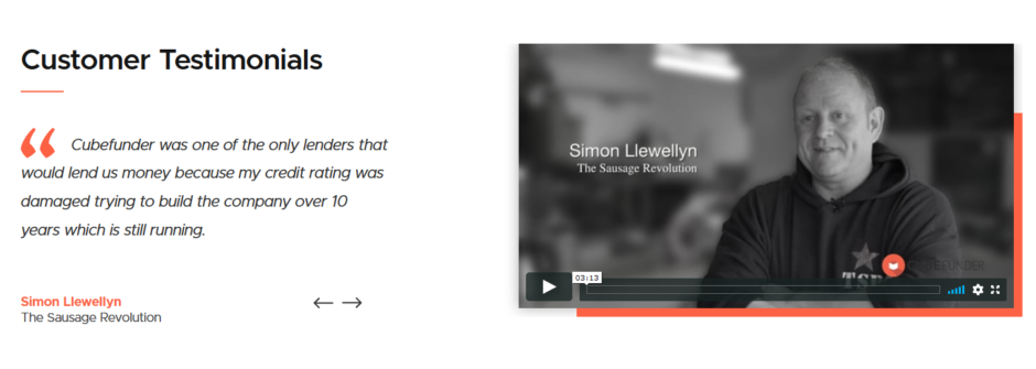 Na página de destino do Cubefunder, eles exibem depoimentos de clientes, imagens e vídeos. Ao veicular anúncios pagos nesta página, eles devem usar o mesmo depoimento e imagem ou vídeo para manter a consistência entre os anúncios e uma página de destino.