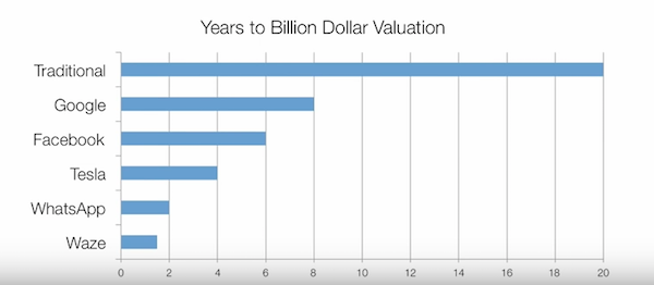 Se você fizer algo que possa ressoar na mente do cliente, poderá ter esse grande impacto. Anteriormente, costumava levar 20 anos para uma empresa tradicional da Fortune 500 atingir uma avaliação de US$ 1 bilhão. Mas a tecnologia iminente, especificamente a revolução móvel nas economias emergentes, reduziu o intervalo de tempo para um ano e meio.