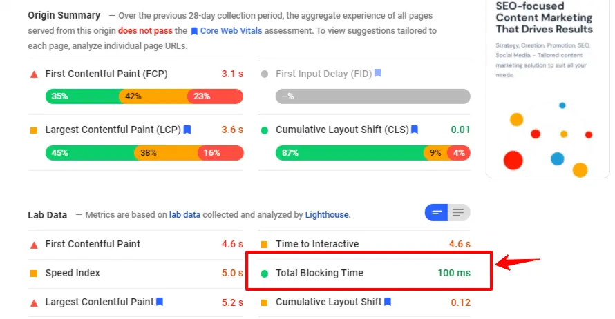 A análise de desempenho da ferramenta mostra todos os Core Web Vitals marcados claramente com cores como verde para bons resultados e vermelho para uma página que não está devidamente otimizada.