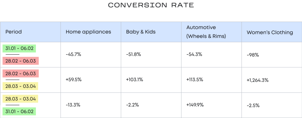 Ao mesmo tempo, a taxa de conversão quase voltou ao normal um mês após a invasão. Exceto para a tarifa Automotiva que a CR aumentou devido à sazonalidade.