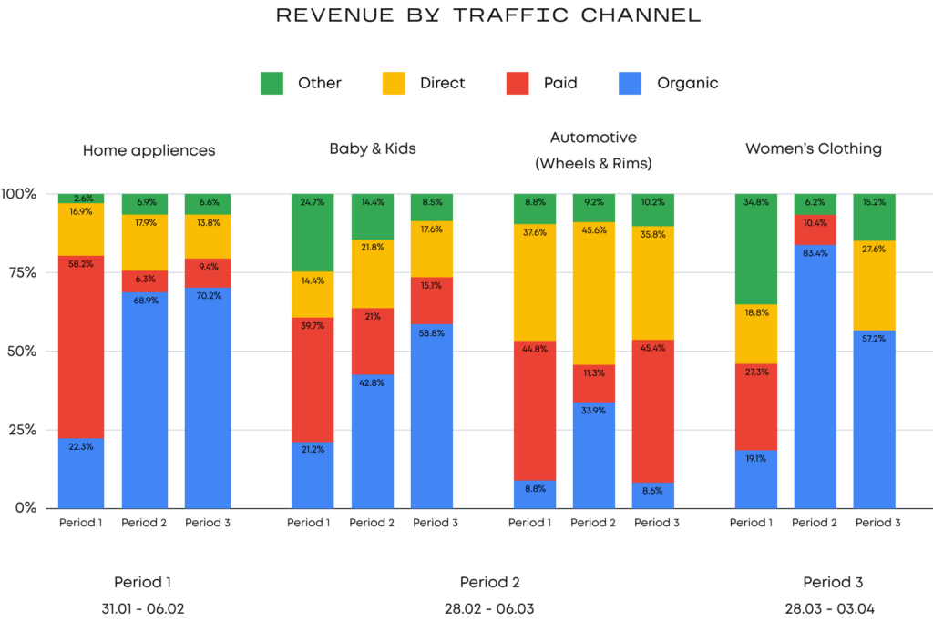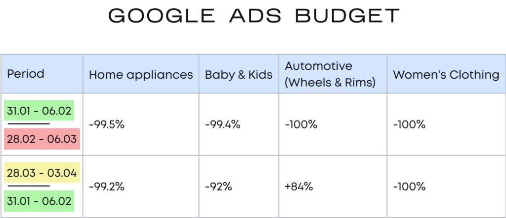 Espera-se que todos os varejistas na Ucrânia tenham tomado a decisão de interromper suas campanhas publicitárias desde a manhã do primeiro dia da invasão. Na semana seguinte, verificamos que algumas campanhas foram retomadas, porém em meados de abril, os varejistas de comércio eletrônico não arriscam investir seu dinheiro no Google Ads.
