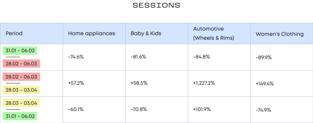 No dia da invasão russa, todas as lojas online perderam em média 82,7% das sessões. Naquela semana notamos um pequeno crescimento.