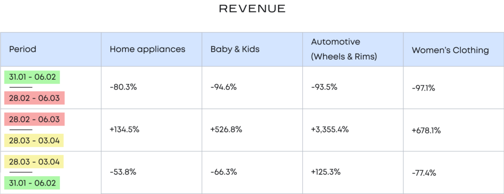 Praticamente a mesma situação que podemos ver no relatório de transação. O nicho de vestuário foi o que mais sofreu, pois esses bens não são essenciais. No entanto, podemos notar um aumento de 1264,5% nas transações um mês após a invasão. Acreditamos que esta situação pode mudar significativamente quando estiver mais quente lá fora, já que muitas pessoas que fugiram não levaram roupas de verão com elas.