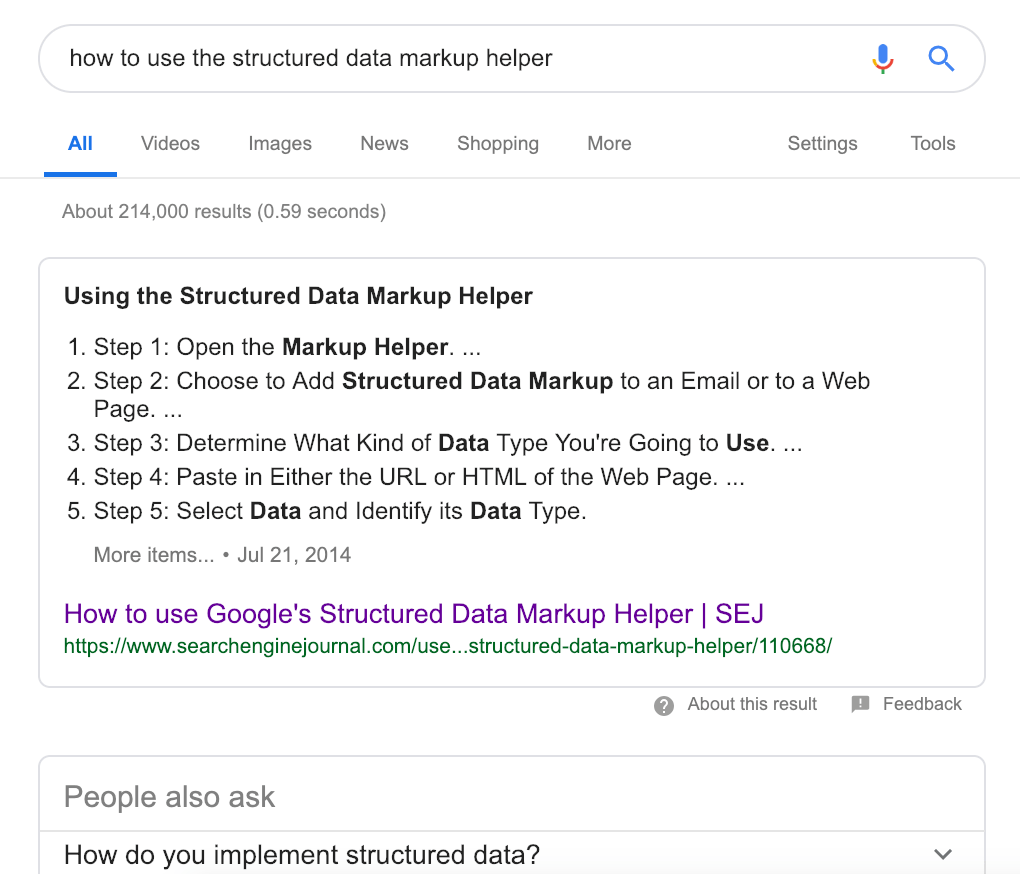 De acordo com o Google, você deve “usar dados estruturados para ajudar o Google a entender o conteúdo do seu site e habilitar recursos especiais de resultados de pesquisa para suas páginas”. A propósito, esses recursos especiais de resultados de pesquisa são comumente chamados de trechos em destaque.