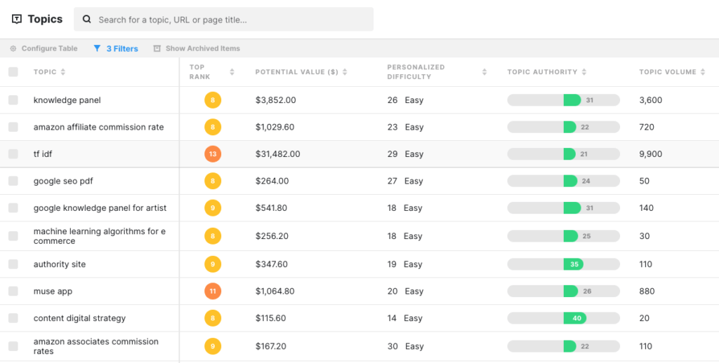 Crie seus próprios filtros personalizados para dividir seu inventário da maneira que quiser no MarketMuse.