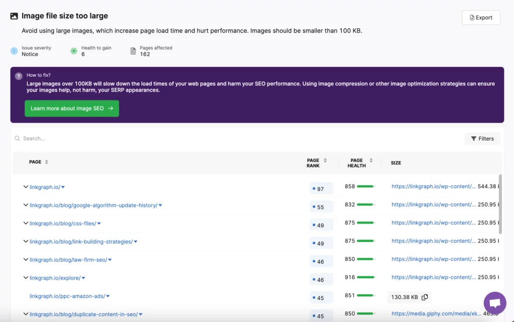 - Tamanho de imagem apropriado : o Site Auditor sinalizará qualquer imagem maior que 100 KB
