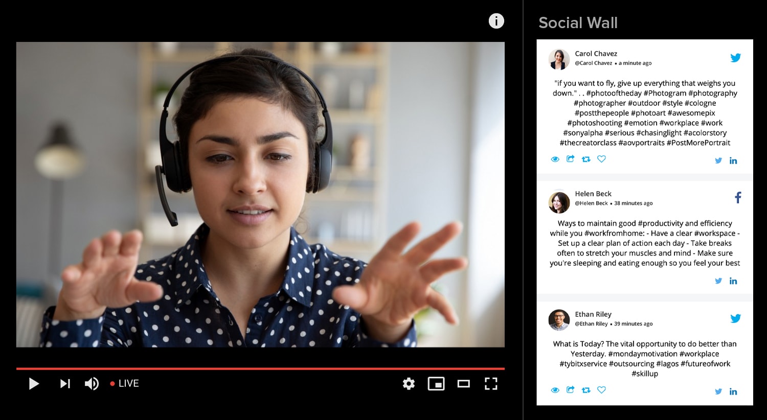 Esse feed de mídia social (ou mural de mídia social) pode ser integrado às suas sessões de transmissão ao vivo, transmissões de sites, feed de eventos virtuais ou qualquer outro evento digital com uma tela ou dispositivo.