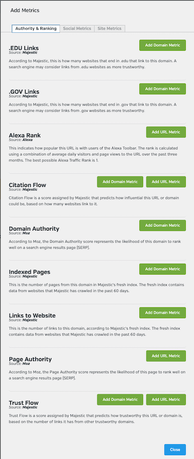 Uma das minhas ferramentas favoritas para analisar a URL de um concorrente é criar um classificador de qualidade de URL de site personalizado, trazendo métricas Raven, Alexa, Moz e métricas majestosas - então será algo assim: