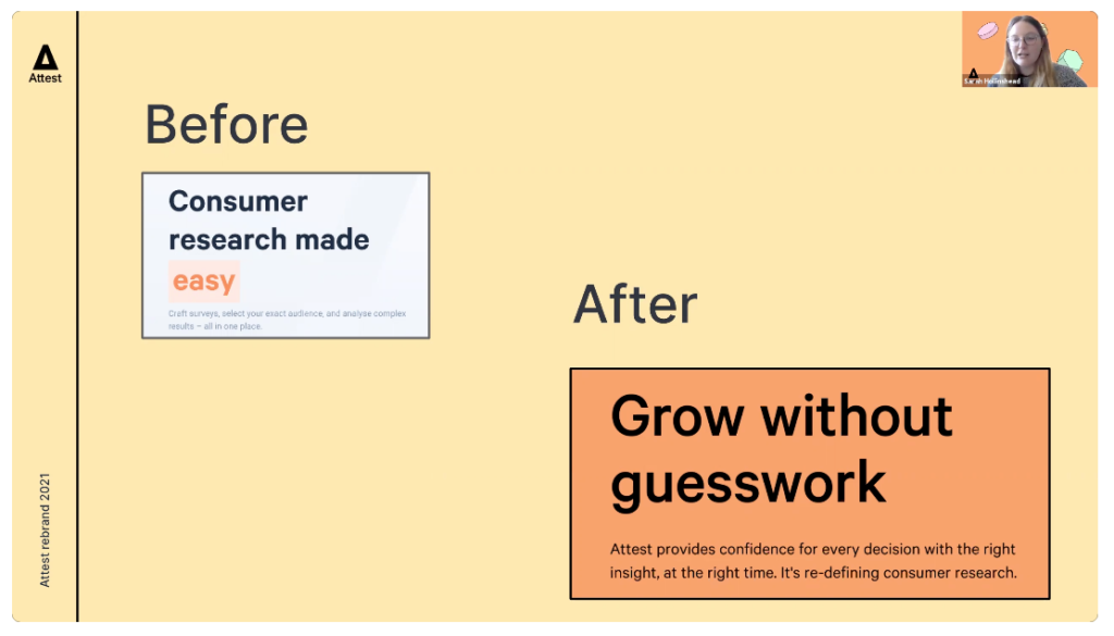 Eventualmente, decidimos pela 'descoberta'. No geral, achamos que este território era o mais forte e tinha o maior potencial de sucesso. Achamos isso empolgante porque desafia o status quo de nosso posicionamento atual e nos diferencia em nosso cenário de concorrentes. Também se alinhou com a nossa ambição de ser diferente – projetando uma personalidade de marca forte, inteligente e única. Qual é o ponto de rebranding se não planejamos nos destacar!
