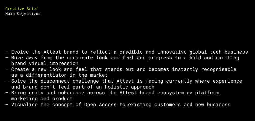 Nosso briefing exigia um conjunto distinto de códigos de marca que tornassem a Attest instantaneamente reconhecível entre nossos usuários e públicos-alvo. Sabíamos que queríamos injetar alguma emoção e queríamos que a aparência da nossa marca ganhasse vida através do desenvolvimento de uma nova identidade visual (este trabalho incluiria definir cores, estilo de ilustração, iconografia, fotografia e direção de arte). Como parte do processo de rebranding, também queríamos criar um guia de estilo e diretrizes de tom de voz.