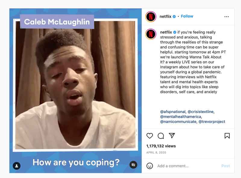 Eles iniciaram uma série no Instagram Live, onde os indivíduos podiam conversar com profissionais da área de saúde mental, fazer perguntas e discutir seus problemas. Qualquer empresa que se conectar com os clientes dessa maneira se beneficiará a longo prazo, porque esses clientes permanecerão leais por muito tempo depois que a crise passar.