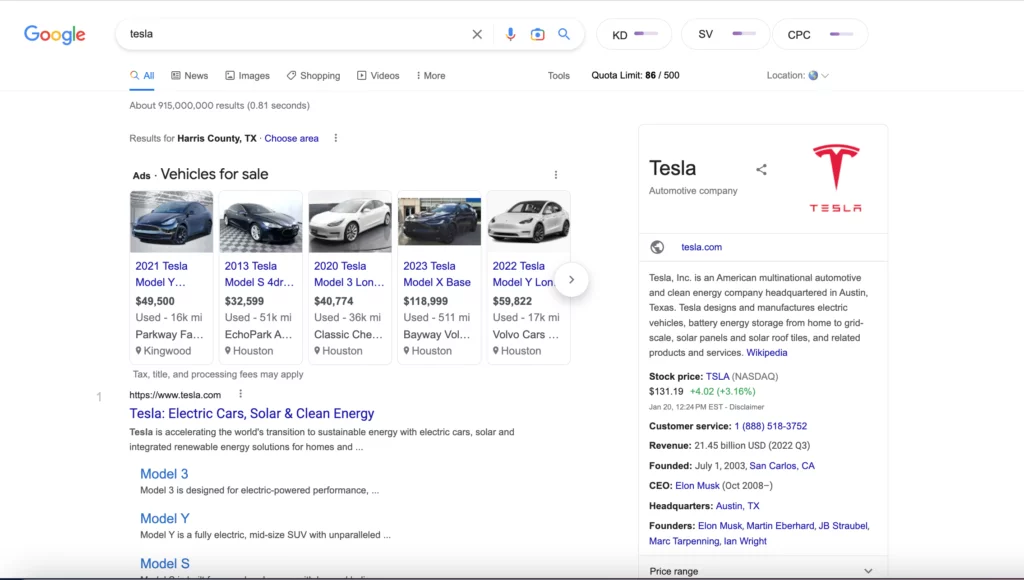 Mas para marcas corporativas que têm uma grande presença online, as pesquisas de marca podem produzir outros tipos de resultados, como páginas da Wikipédia, artigos de notícias, preços de ações, etc.