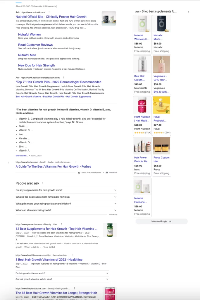 No caso acima, o Google está exibindo anúncios, produtos específicos, bem como blogs que comparam vários recursos e benefícios de várias marcas de suplementos para crescimento capilar.