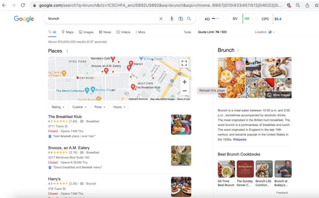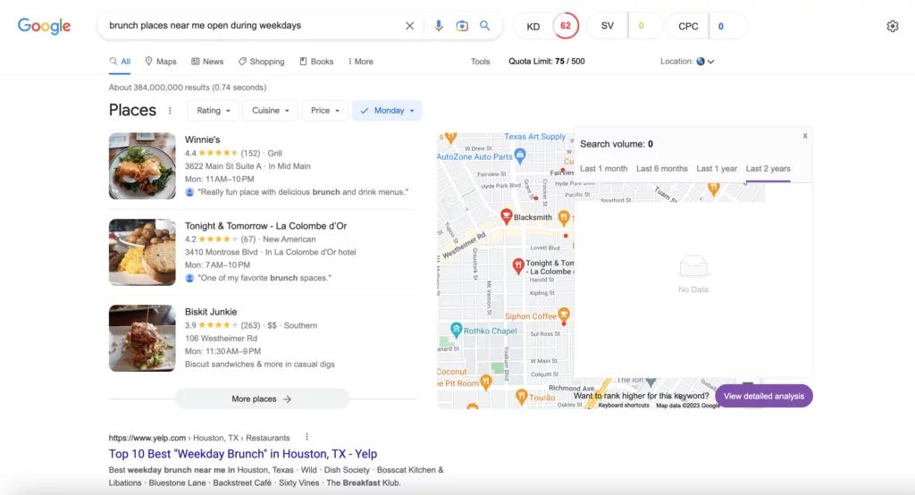Por outro lado, se um usuário digitar o termo de pesquisa “lugares para brunch perto de mim abertos durante a semana”, o Google entenderá muito melhor o que o usuário está procurando. Eles mostram ao usuário uma lista de restaurantes no Pacote de Mapas que estão abertos durante a semana. Além disso, o resultado da página da Web de melhor classificação é uma lista completa de todos os restaurantes de brunch durante a semana no local do pesquisador.