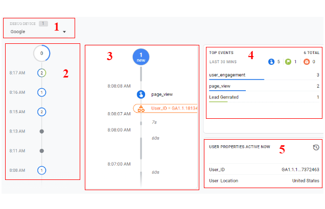 9. Verificação e auditoria rápidas de dados são incorporadas à interface do usuário. Implementação de depuração fácil graças ao relatório DebugView em tempo real. Este relatório permite monitorar dados em tempo real sobre os eventos do seu site e parâmetros personalizáveis e propriedades do usuário.