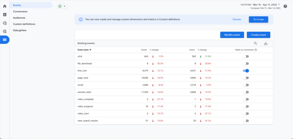 7. Fácil configuração de conversão e acompanhamento de eventos. Ao contrário do Universal Analytics, no GA4, você pode marcar facilmente qualquer evento registrado como uma conversão.