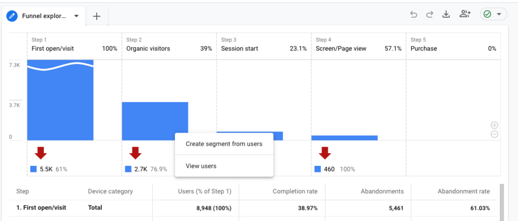 No mesmo relatório, você pode criar segmentos para qualquer etapa do funil