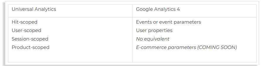 - Dimensões e métricas personalizadas. Para que dimensões e métricas personalizadas sejam incluídas nos relatórios do GA 4, elas precisam ser transferidas para o novo recurso de acordo com as regras do Google. Por exemplo, se os parâmetros de nível de hit e nível de usuário tiverem análogos no GA4, não haverá equivalente para os parâmetros de nível de sessão. Alternativamente, você pode defini-los no nível de acerto. Para usar definições personalizadas de nível de produto, elas devem ser adicionadas separadamente. Como isso vai funcionar ainda não está claro. O recurso ainda está em andamento e não há relatórios de comércio eletrônico contendo definições personalizadas de nível de produto.