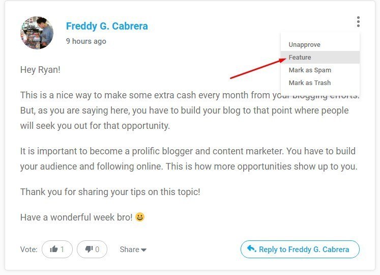 Como administrador, você pode facilmente apresentar um ótimo comentário e moderar outros sem necessariamente acessar o painel. Assim que um comentário for apresentado, ele permanecerá no topo da lista de comentários, apesar da ordem de classificação.