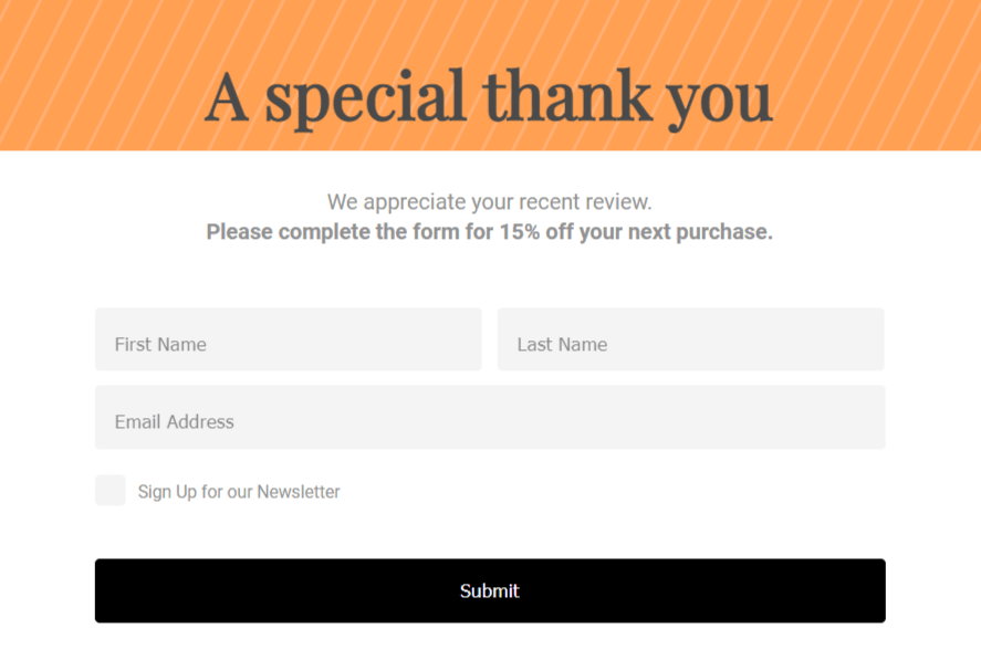 Generați bunăvoință cu strategia dvs. de evaluare a clienților, mulțumindu-le clienților. Trimiteți-le un cod promoțional sau un cupon pe care să-l folosească la următoarea lor achiziție.