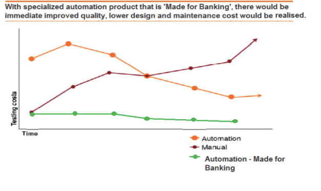 Așa cum a făcut orice altă industrie la început, Banca a încercat, de asemenea, să-și satisfacă nevoile de testare și conformitate cu calitatea, făcând-o manual. Dar, având în vedere unicitatea peisajului și ciclurile de viață lungi pe care le prezintă banca, testarea manuală nu a fost doar consumatoare de timp, ci și incompletă în majoritatea scenariilor care implicau testare end-to-end . Calculele financiare complexe au fost de obicei evitate, iar testarea a fost limitată la o simplă verificare a stării – reducând astfel eficiența testării și lăsând-o până la sfârșit până când utilizatorii de afaceri efectuează teste de acceptare de bază.