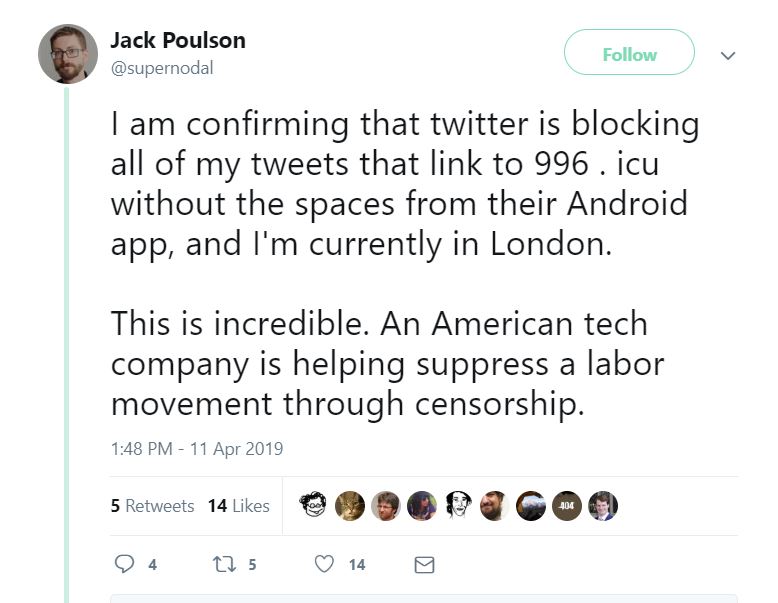 În ultimele zile, protestele legate de această cultură se confruntă cu un aparent ordin de călușă din partea rețelelor sociale. În timp ce platformele locale, cum ar fi Weibo, trebuiau să minimizeze comentariile împotriva lui Jack Ma, în mod surprinzător, Twitter ar fi suprimat și tweet-urile legate de acest subiect, unii utilizatori de pe Twitter că site-ul de microblogging nu le permite să menționeze 996.ICU, care este numele. dat acestei revoluții de muncă care se desfășoară în China.