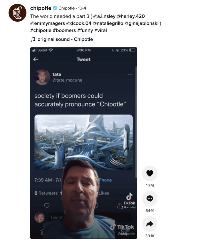 Un brand grozav care și-a valorificat designul grafic prin conținut video recent a fost Chipotle. A folosit o platformă Tiktok predominant milenială și bazată pe Gen-Z, pentru a elimina mickey-ul de la provocatorii Boomers să spună corect numele mărcii. Cu siguranță să spun că a funcționat un răsfăț!
