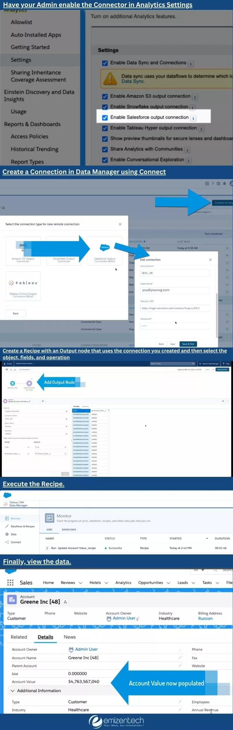 Pentru a satisface o astfel de nevoie aici sosesc conectorii de ieșire. Acestea ajută la transmiterea datelor din CRM Analytics către sistemul de la distanță. Astfel de conectori dețin calibrul de a împinge date ca parte a unui nod de ieșire de pregătire a datelor, iar unii pot chiar împinge date nepregătite folosind sincronizarea.