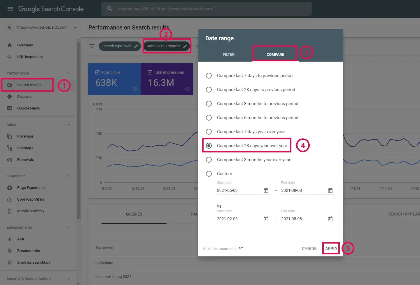 Selectați o perioadă înainte de reproiectare și o perioadă după lansare pentru a compara performanța dvs. organică a traficului.