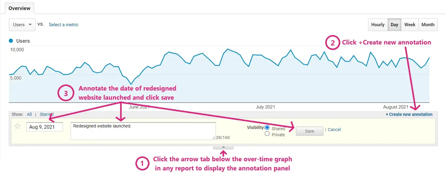 După lansarea reproiectării, luați în considerare adăugarea unei adnotări în Google Analytics. Acest lucru vă ajută să marcați când a avut loc reproiectarea și modificările cheie pe care le-ați făcut.