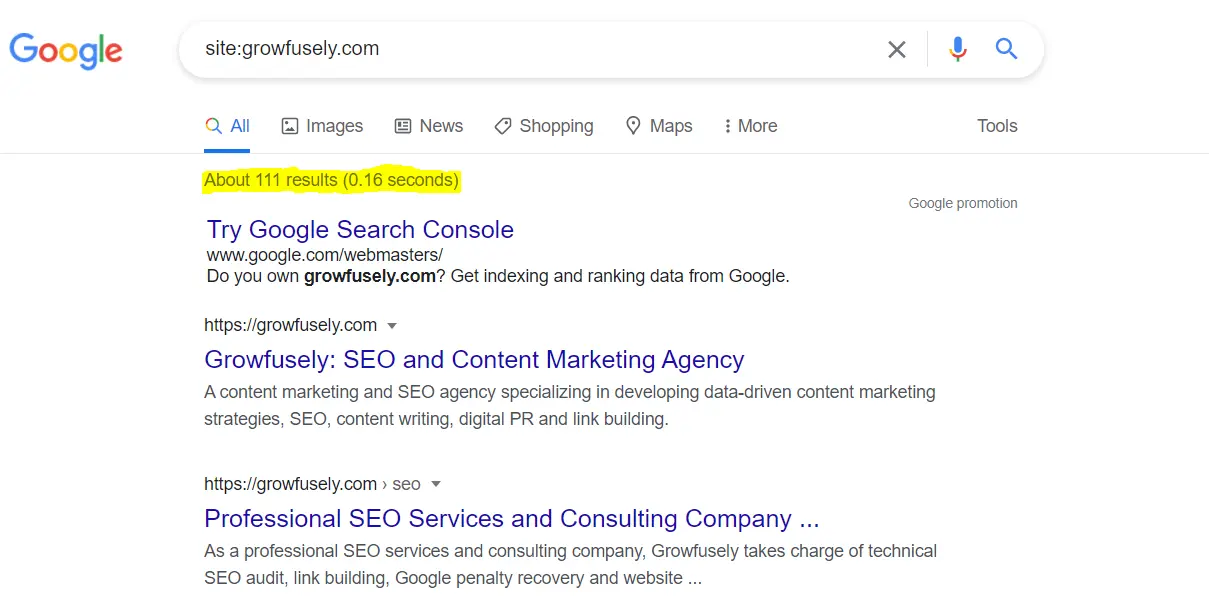 Introduceți site:yourdomain.com în Google pentru a vedea numărul de adrese URL indexate.