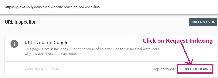 După ce pagina dvs. este găsită, selectați Solicitați indexare.