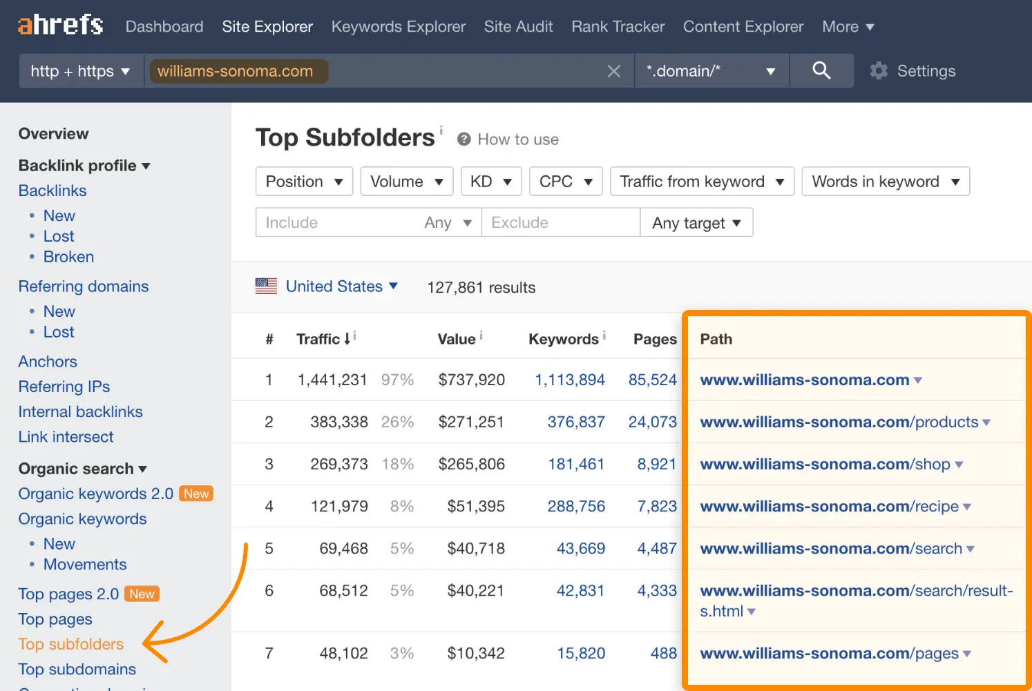 A avea o structură similară (nu o copie exactă) cu cea a concurenților tăi creează un sentiment de familiaritate pentru publicul tău. Introduceți site-ul concurenților dvs. în Site Explorer al Ahrefs și verificați cum contribuie fiecare secțiune a site-ului lor la traficul organic general.
