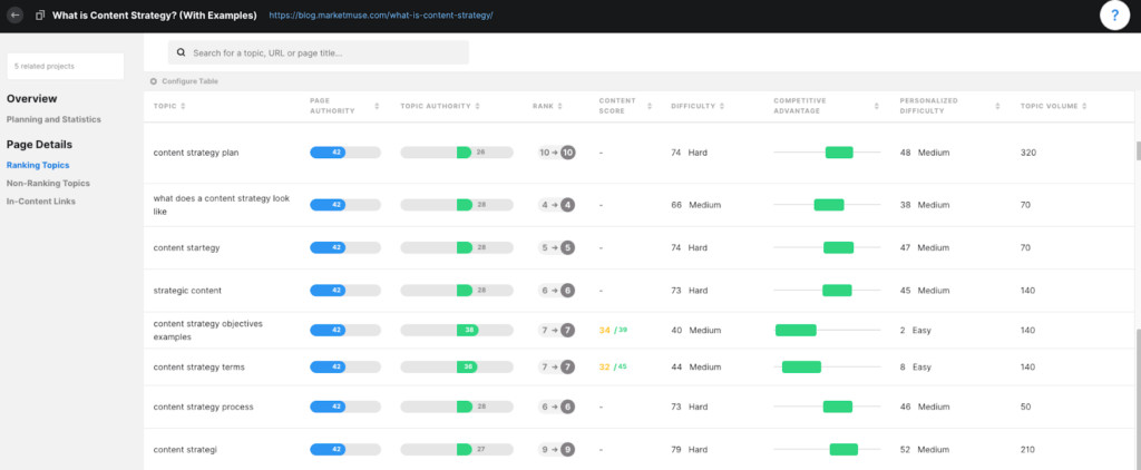 Verificați dacă nu există o altă pagină cu clasare mai mare, ceea ce, dacă utilizați MarketMuse, este ușor de realizat folosind Vizualizările salvate.