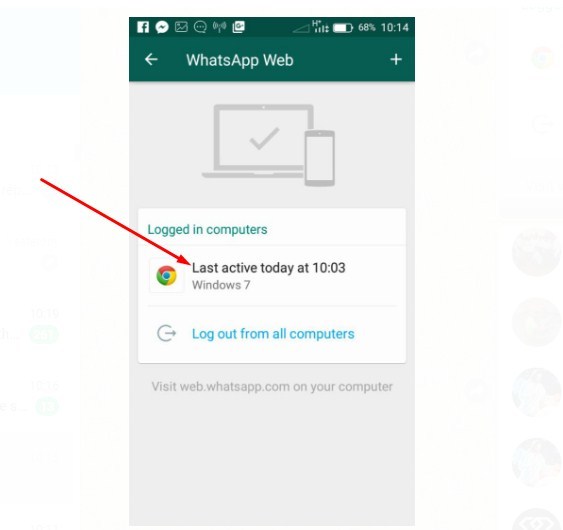 O altă metodă este să verifici din meniul Whatsapp dacă există vreo conexiune activă care nu este a ta. Rețineți că Whatsapp web nu poate funcționa în mai mult de un browser sau filă de browser simultan. Dacă sunteți conectat la computerul A, în momentul în care vă conectați la computerul B, veți fi deconectat de la computerul A.