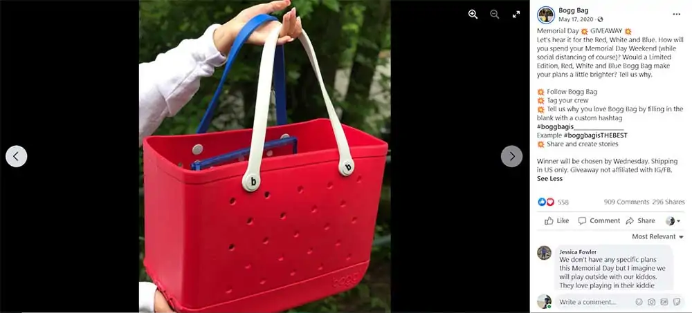 Еще один хороший пример: в прошлом году Bogg Bag запустила раздачу хэштегов на выходных, посвященных Дню поминовения. Их аудитории было предложено подписаться на их страницу, отметить своих друзей, а затем прокомментировать, используя уникальный хэштег, включающий название их бренда.