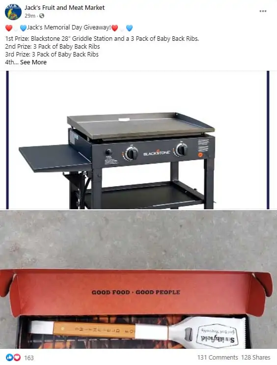 Например, обратите внимание, как Jack's Fruit and Meat Market запустила конкурс комментариев, чтобы выиграть, ко Дню поминовения на Facebook. Они попросили своих подписчиков отметить трех друзей в комментариях, а также поставить лайк и поделиться публикацией. Это помогло им получить более 100 комментариев и репостов всего за 30 минут после публикации.