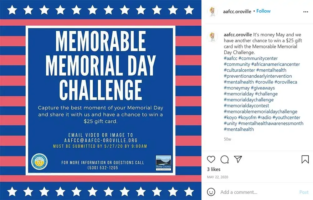 Например, в прошлом году AAFCC Oroville провела фото- и видеоконкурс в честь Дня поминовения. Они попросили своих подписчиков запечатлеть лучший момент дня и поделиться им с ними.