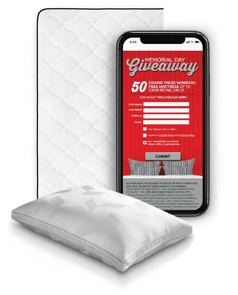 Например, компания Mattress Firm запустила акцию в честь Дня поминовения, в рамках которой они устроили розыгрыш мгновенного выигрыша. Посетители должны были заполнить форму и могли мгновенно выиграть один из пятидесяти матрасов, каждый из которых стоил 3000 долларов. Даже те, кто не выиграл, получили купон на скидку. Это стимулировало их участие, посещения веб-сайта и продажи.
