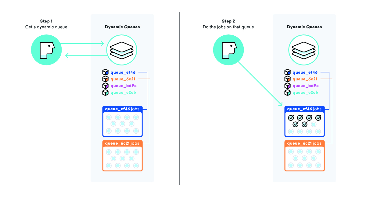 Используя эту стратегию, мы можем поручить рабочим выбрать имя динамической очереди из списка «динамических очередей», а затем обработать все задания в этой конкретной очереди. Это позволяет нам гарантировать, что сообщения отправляются как можно быстрее И что все наши клиенты обрабатываются с одинаковым приоритетом.