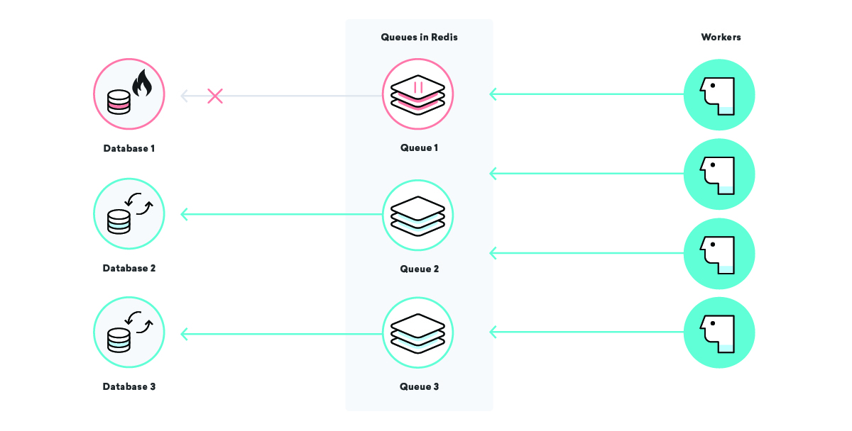 Мы можем исправить это, используя хорошо подобранные имена очередей и приостанавливая определенные очереди по мере необходимости. Имея это в нашем наборе инструментов, мы можем хирургическим путем снизить нагрузку на элементы инфраструктуры. В приведенном выше сценарии, как только мы узнаем, что база данных Global Gizmos не работает, мы можем приостановить их очередь обработки данных до тех пор, пока не узнаем, что она восстановлена, гарантируя, что один конкретный сбой не повлияет на других клиентов!